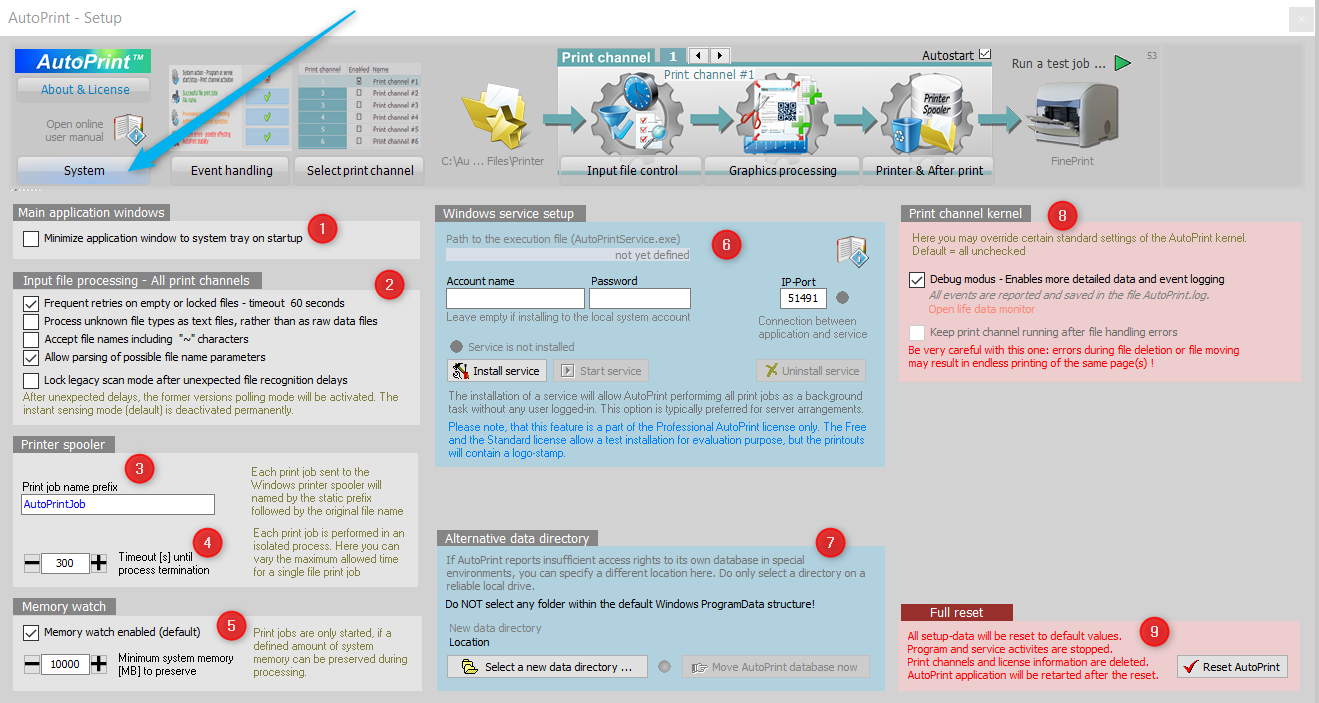 Open the System tab in the AutoPrint - Setup area: